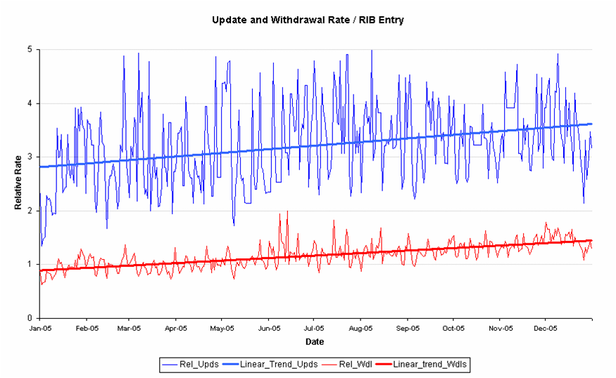 So if we want to look at the trends in BGP, perhaps we should be looking at the update and withdrawal rates of individual prefixes, rather than looking at the level of BGP protocol update messages. So what data is available for the number of prefix updates across 2005?