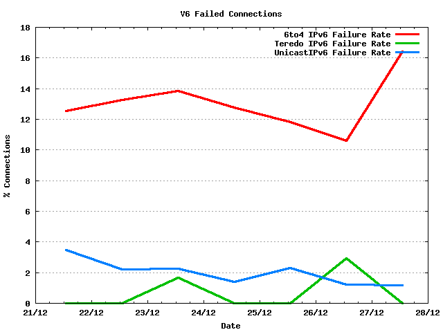 Within the set of IPv6 connections, the connection failure rate can be further delineated between the various access types. Connections using 6to4 have a failure rate of some 13% on average. Teredo failure rates, on the other hand, are far lower at between 1 to 2%. The non-auto-tunnelled IPv6 connections have a failure rate of 2%, which is 10 times the equivalent IPv4 average failure rate of 0.2%