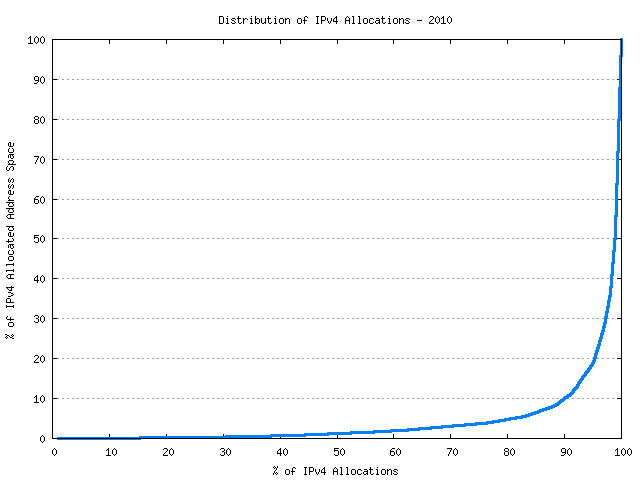 Another way to look at the address distribution is in terms of "skew". If the Internet is populated by a largely homogenous population then the distribution of address allocations would be relatively uniform, such that the group of largest allocations would not be vastly larger than the group of smallest allocations. One way to look at the level of skew is to use a cumulative distribution plot, comparing the number of allocations to the amount of address space, shown below.
