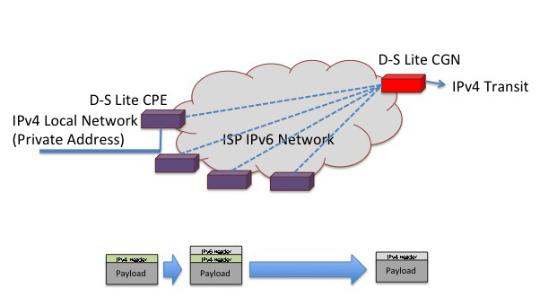 Here the customer NAT is effectively replaced by a tunnel ingress/egress function in the Dual-stack lite home gateway. Outgoing IPv4 packets are not translated, but are encapsulated in an IPv6 packet header, where the IPv6 packet header contains a source address of the carrier side of the home gateway unit, and a destination address of the ISP's Gateway unit. From the Service Provider's perspective each customer is no longer uniquely addressed with an IPv4 address, but instead is addressed with a unique IPV6 address, and provided with the IPv6 address of the provider's combined IPv6 tunnel egress point and IPv4 NAT unit.