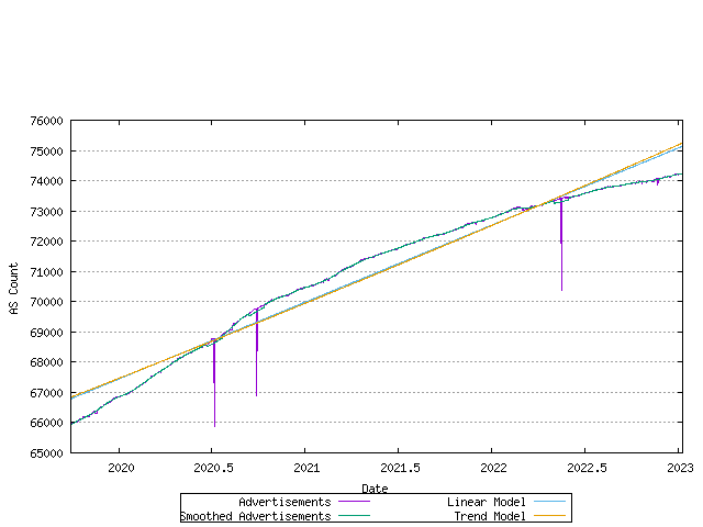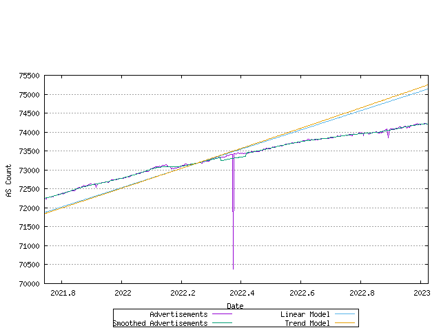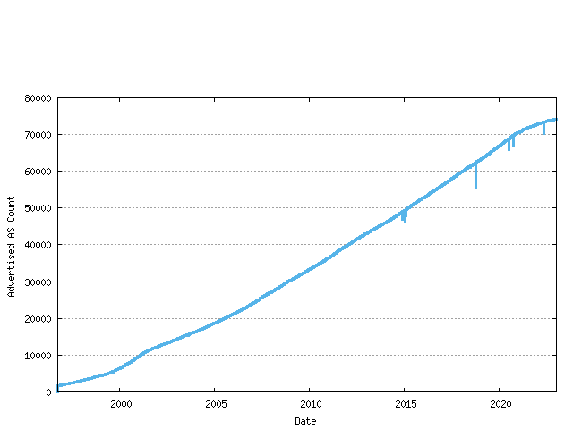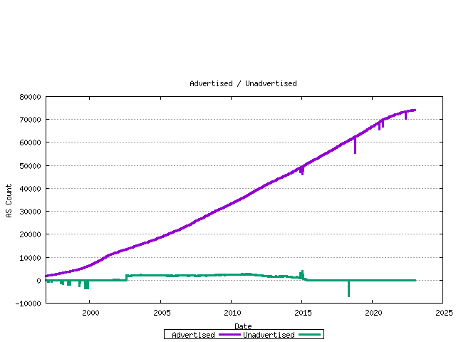 Figure 11 - Advertised AS CountThe difference between the assigned AS number count and the advertised AS number count is the unadvertised AS count. The following figure shows the number of advertised and advertised ASs as a time series.