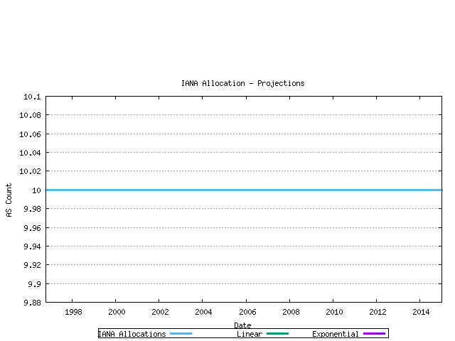The question posed in this section is: when will the pool of 16 bite AS numbers be exhausted? The methodology used here is that of using previous allocation information to generate a trend model, and use that trend to extrapolate likely future consumption levels, and thereby generate a predicted exhaustion point. Of course making assumptions about the future has its risks, and often the future does not conform to current expectations. This is a quote from RFC1930, published in March 1996: