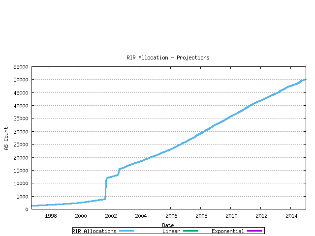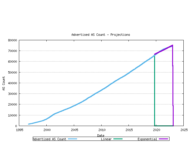 9. AS Space exhaustion The AS number space is a finite amount of address space. It is currently defined as a 16 bit integer and hence limited to 65535 unique AS numbers. At the time of writing some 5,100 ASes have been allocated and a little under 600 ASes are actively routed in the global Internet. It is clear that this growth needs to be continually monitored. However, if the criteria applied above are adhered to, then there is no immediate danger of AS space exhaustion. It is expected that IDRP will be deployed before this becomes an issue. IDRP does not have a fixed limit on the size of an RDI. RFC 1930, "Guidelines for creation of an AS" J. Hawkinson, T. Bates, March 1996.With that cautionary note about making assumptions about the future in mind, it is now possible to use this data to generate some predictive models of AS Number consumption. The technique used here is to use recent AS number consumption data in a time series, apply a best fit to the data using a least squares best fit, and then using the derived slope and intercept to generate a predictive trend line. This technique provides a linear best fit projection model. It may be the case that the underlying environment is driven by compound rowth factors that create accelerating growth. The technique used here is to perform a least squares best fit on the logarithm of the data points, derive the best fit slope and intercept to generate a trend series, and then exponentiate the trend data to create a best fit trend model that exhibts exponential growth.