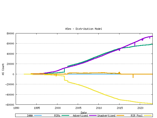 AS numbers are drawn from the Unallocated AS Number Pool, administered by the IANA. The IANA data from the period 1992 until the present is shown in the following time series. These allocations are made to the Regional Internet Registries (RIRs), and the allocation unit is in blocks of 1024 AS Numbers.