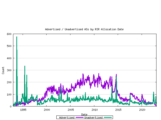 Figure 13 - Advertised / Unadvertised AS CountTaking the current set of assigned AS numbers, the set of advertised and unadvertised AS numbers can be matched against the RIR date of assignment. This is shown below.