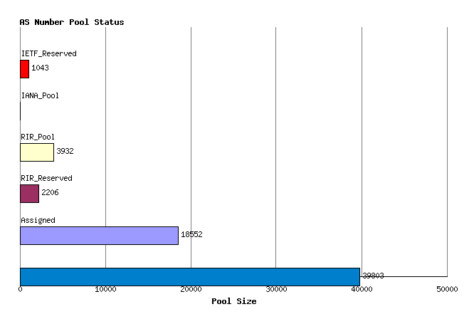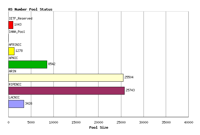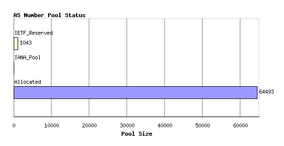 Figure 1 - AS Number Pool StatusThis allocated number pool is managed by the Regional Internet Registries, (RIRs) and the breakdown of IANA allocated AS number blocks to each of the RIRs is as follows: