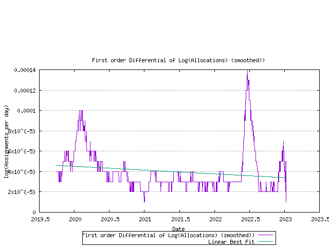 Figure 26 - First order differential of allocation rateThere is a rising trend in this data, indicating that an exponential model may be a better fit. here the first order differential of the log of the data is shown in the following figure.