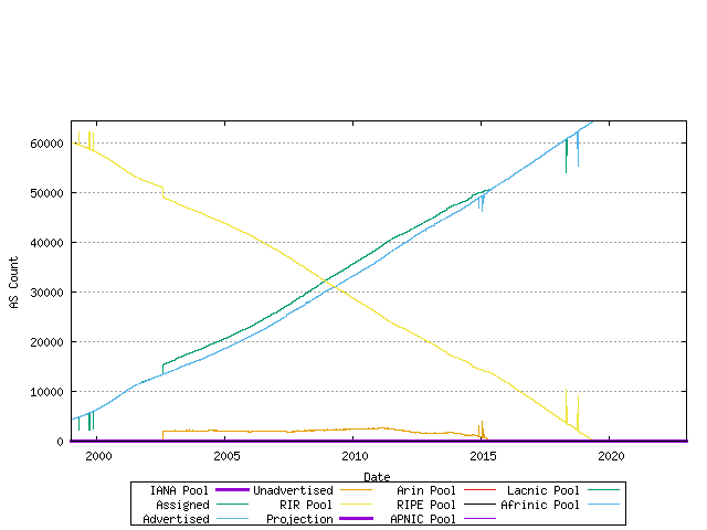 Using a model of each RIR's relative rate of allocation, it is possible to generate a model of 16-bit AS number consumption. Here the end point is the date where the first RIR has exhausted its available pool of 16-bit AS numbers, and no further numbers are available in the IANA unallocated pool to replenish the RIR's pool. The data available suggests a best fit predictive model where this will occur on 09-Jan-2023.