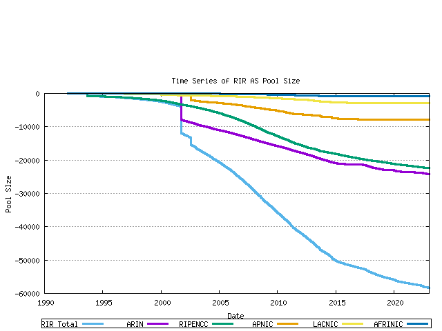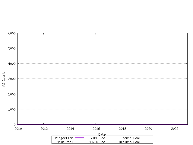 Figure 28 - RIR Pool size - projectionUsing this model of each RIR's relative rate of allocation, it it possible to generate a model of AS number consumption. Here the end point is the date where the first RIR has exhausted its available pool of 2-byte AS numbers, and no further numbers are available in the IANA unallocated pool to replenish the RIR's pool. The data available suggests a best fit predictive model where this will occur on 09-Jan-2023.