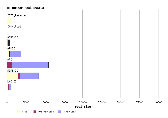Figure 2 - AS allocations to RIRsAny individual AS number can be in any one of four states: part of the IANA unallocated number pool, part of the unassigned pool held by an RIR, assigned to an end user entity but not advertised in the routing system, and assigned and advertised in BGP. The current totals of AS numbers according to this set of states is: